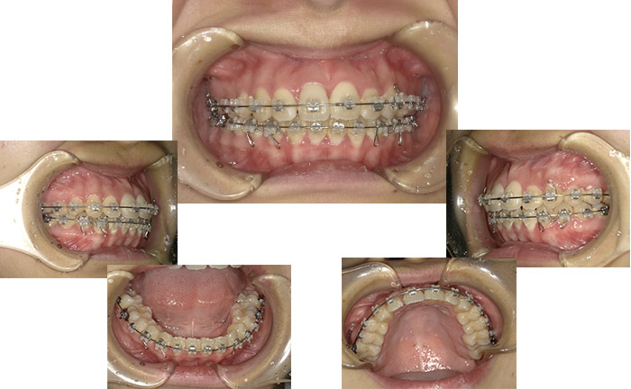 | 上下4本の第一小臼歯の抜歯を行った。著しいDolico faicial patternのため、可能な限り弱い矯正力の適用、口唇の筋力を利用した前歯の後方移動などのメカニクス上の配慮を行った。 |
